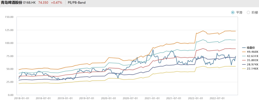而从PE的角度看来看,青啤2023年的前瞻市盈率为30%,从过往PE波动空间来看,也仍是中间偏下的状态,尚未回到平均区间。