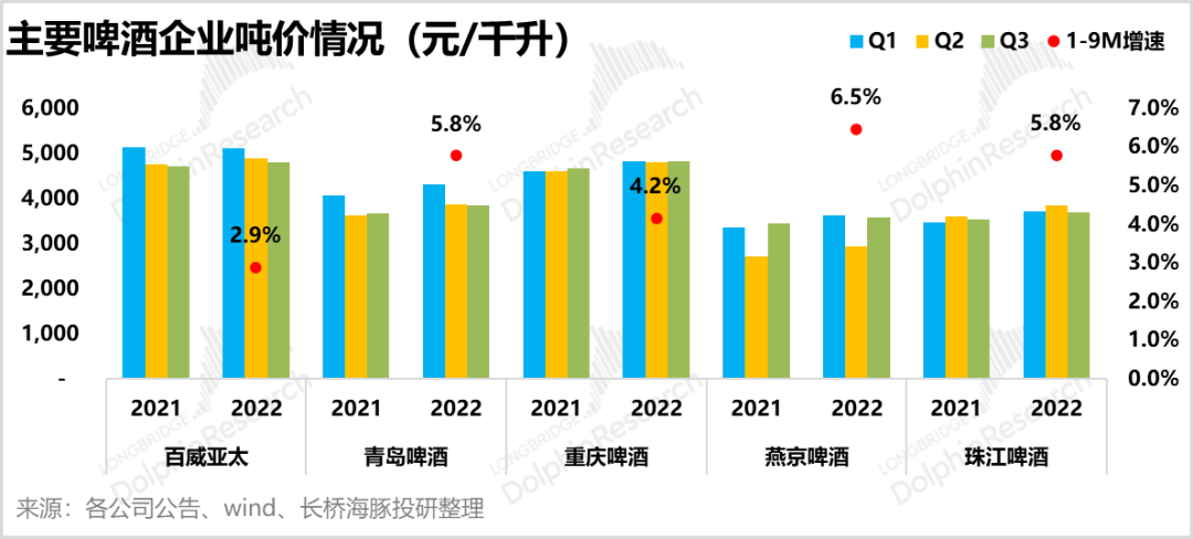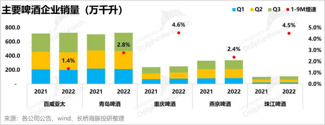 而对应三季度各家销量上(由于华润港股没有三季度,对比数据不含华润),走出疫情之后,加上超长待机的炎热天气,让三季度各家啤酒企业销量都有不错的提升:其中量的绝对上不大的重啤提升最多,前九个月增长接近5%,而高基数纸上的青啤也还算不错,有接近3%。