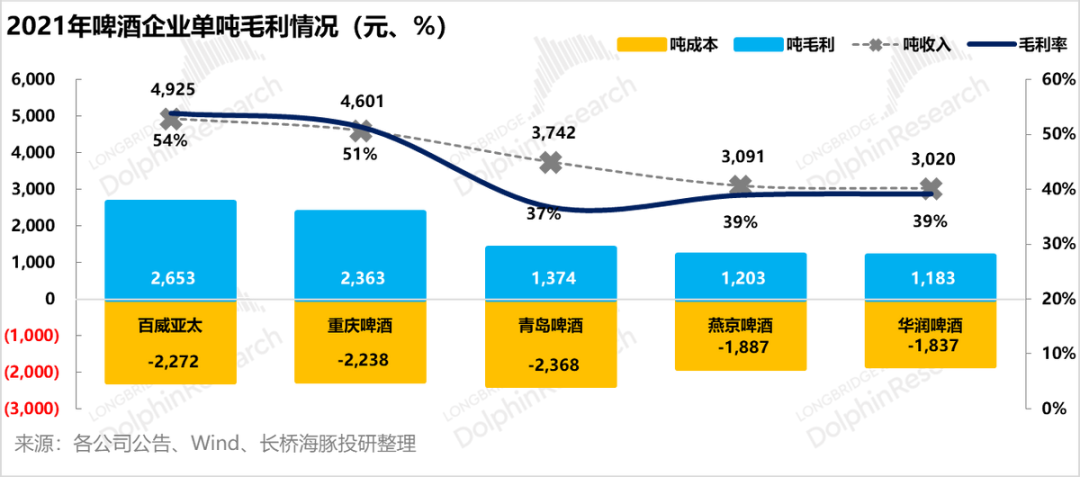海豚君选取了五家头部啤酒公司,大家来感受一下:高吨价(PS:蓝色为毛利、黄色会成本,合起来柱子的长度就是单吨收入,我们按照柱子的整体高度来排序)基本对应着更高的单吨利润,包装让依然是易拉罐、玻璃瓶、瓦楞纸这种东西,成本上没啥本质区别,结果就是单价越高、毛利率越高。