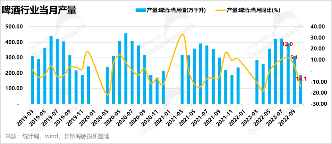 今年前十月啤酒产量相比2021年基本零增长,所以行业量的维度上仍然是停滞状态,而且前十个月拉平的销量主要也是靠“天”而来:今年夏天由于天气高热持续时间太长带来,从7-8月份产量基本上还在11-12%,进入十月产量下滑其实比较大。