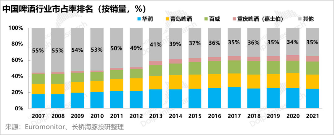 虽然行业2013年之后已经进入整体萎缩,但龙头市占率仍在缓慢提升:两大国资玩家(华润、青岛)+两大外资玩家(百威+重啤)构成的龙四市占率从2013年到2017的四年间还提升了六个百分点。