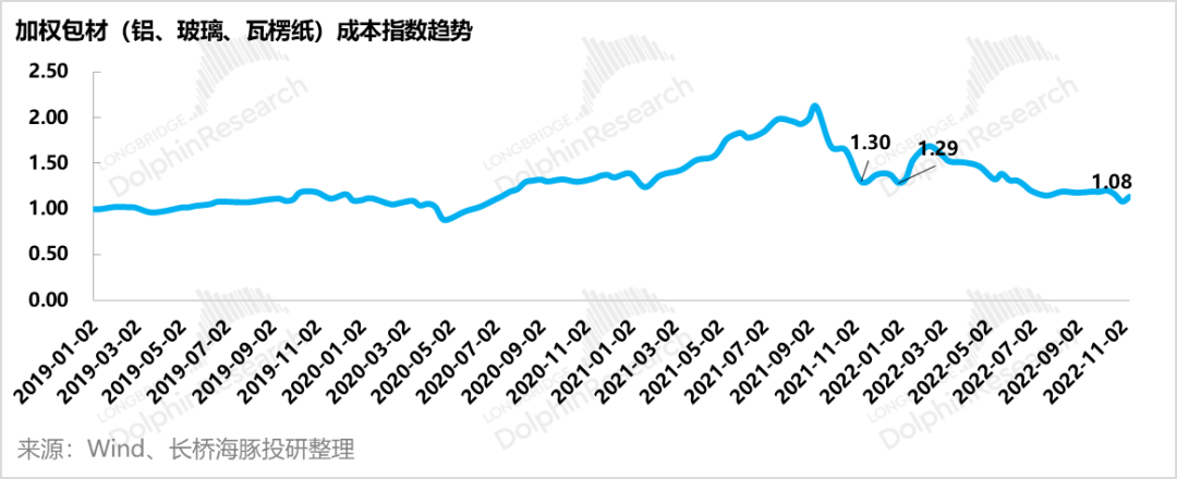 而如果往后展望的话,毛利率上如果以2021年底为基点,下半年美国猛加息后,海豚君基于铝、玻璃、瓦楞纸在包材成本的占比权重粗估出来的整体包材成本下行了差不多20%。