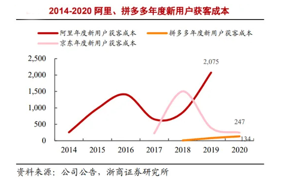 这也直接导致了淘特获客成本的居高不下。公开资料显示,2016年时拼多多新增用户的获客成本仅为10元/人,而同一时期淘宝、京东的获客成本分别达到了166元和142元。
