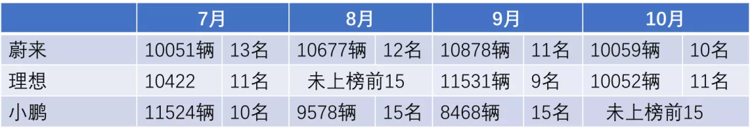 不过,“蔚小理”后来赶了上来。乘联会统计数据显示,今年前三季度,月国内新能源汽车销售排行榜中,小鹏和理想均挤进前10。