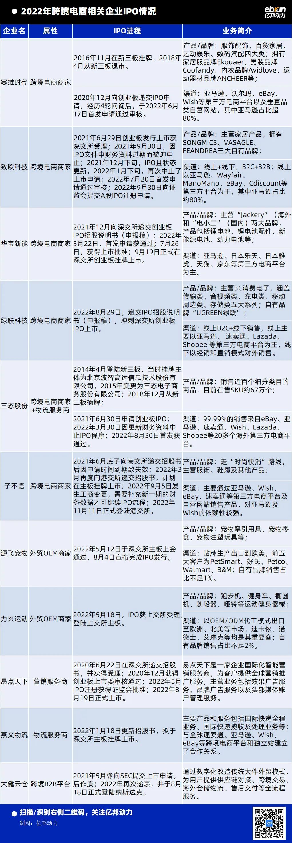 值得一提的是,2022年,即便大多数玩家呼喊着“已入寒冬”,都在相对低增长的状态下推行保守经营策略,但也不乏那些逆风而上的勇者,给行业注入强心剂。据亿邦动力不完全统计,在今年以来,持续冲刺IPO或已成功挂牌上市的跨境电商相关企业,不少于10家。