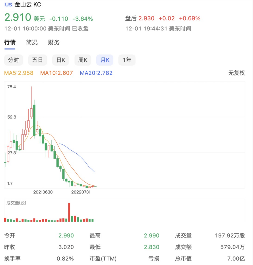 2020年5月,顶着“美股市场纯云概念第一股”头衔的金山云,登陆纳斯达克,上市首日涨超40%。然而,半年后,金山云的股价走势就来到了拐点,并急转直下。收入增长率领先行业,亏损却在不断扩大。