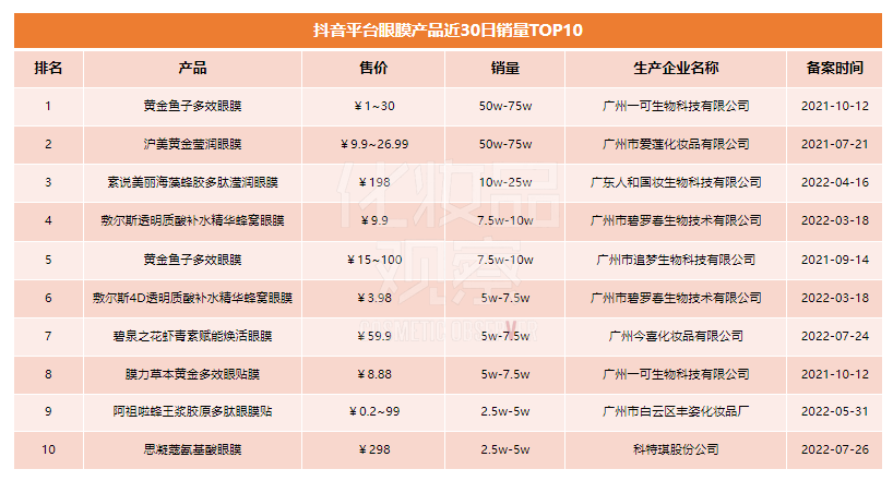 以抖音平台为例,飞瓜数据显示,2022年第一季度,抖音平台眼膜品类的销售额增幅达到616%,增速远超美容护肤行业均值。