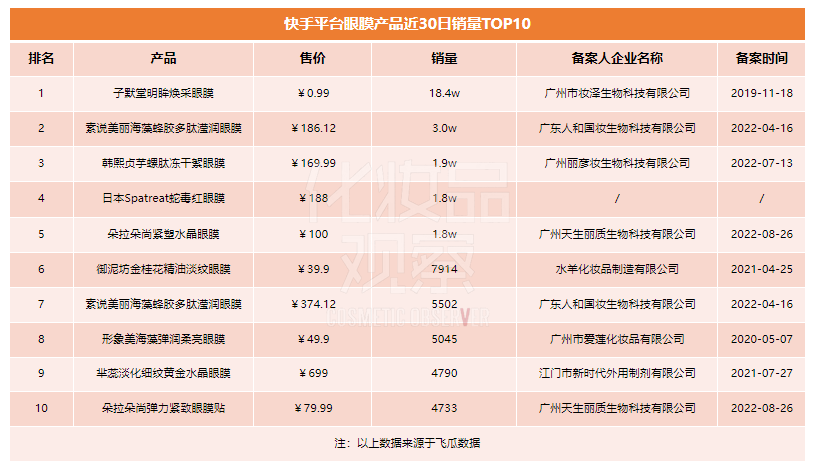在快手平台,近30日销量TOP1的产品为子默堂明眸焕采眼膜,共计售出18.4万件,且售价不足1元。另外,以韩熙贞、芈蕊为代表的“快品牌”,撑起了快手平台眼膜品类的百元以上市场。