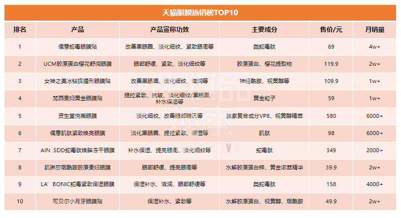 例如,天猫眼膜销量前三的产品价格分别是69元、119.9元、109元,销量TOP10产品中,有5款产品单价在百元以下,其中价格最低的为肌琳莎烟酰胺胶原贵妇眼膜,售价为39.9元/60片。综合天猫三大榜单来看,仅有3款产品单价突破200元,分别是AIN .SDD蛇毒肽焕眸冻干眼膜、资生堂悦薇眼膜以及丸美蝴蝶绷带眼膜,售价分别为349元、580元、208元。