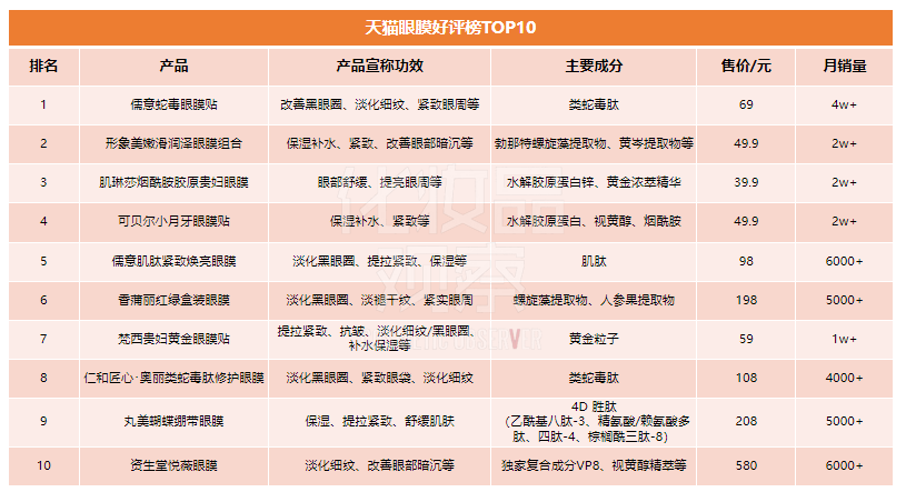 其二,蛇毒肽、视黄醇、胶原蛋白成为眼膜产品热门成分;淡化细纹、去黑眼圈、紧致抗衰为热销眼膜的主打功效。