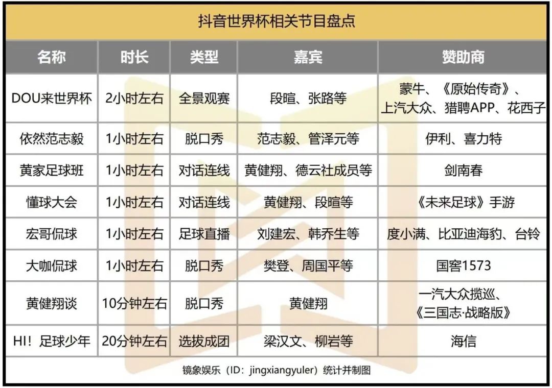此次世界杯相关综艺中,央视上线了《天下足球》《足球盛宴10》《我爱世界杯》《大咖陪看球》等一众新老节目,咪咕视频和抖音也双双发力。抖音上线了包括《DOU来世界杯》《依然范志毅》《黄家足球班》《懂球大会》在内的8档节目,而咪咕视频则推出了《摇滚足球濛友局》《濛主来了之我的眼睛就是尺》《世界杯最强音》等13档节目。