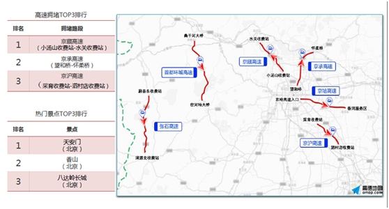 在京津冀地区,9月15日上午部分高速路段易出现严重拥堵,尤其是北京周边出城方向,比如7点-19点京藏高速易拥堵,建议错峰出行或绕行沙阳路。9月15日8点-12点京承高速拥堵严重,建议错峰或者选择望京街、京密路绕行。京津冀地区排名前三的热门景点是天安门、香山、八达岭长城。