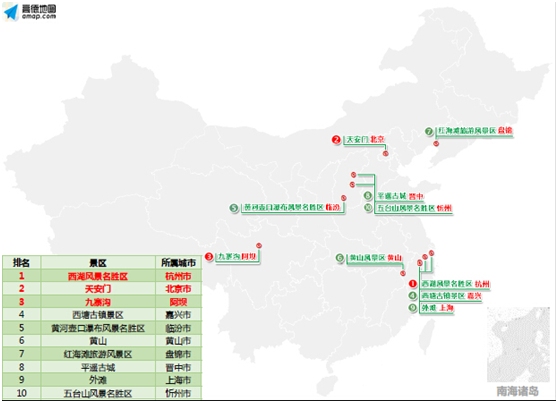 根据高德交通大数据平台统计,在中秋期间全国热门景点中,杭州西湖景区排名第一,北京天安门排名第二,第三位四川九寨沟。景区周边道路在中秋期间预计出现拥堵。