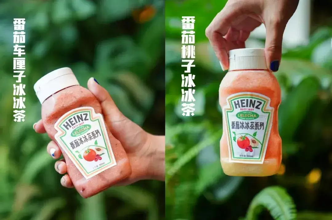 此前,乐乐茶与亨氏联名推出番茄冰冰茶系列新品。包装设计上采用亨氏经典的番茄酱瓶造型,共有番茄桃子冰冰茶、番茄车厘子冰冰茶两个口味,是在沙糖番茄冰沙基础上分别添加桃果肉或车厘子果肉制得,酸甜清爽,好喝又好玩。