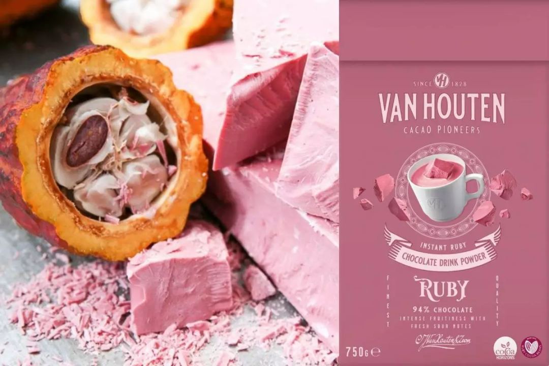 VanHouten ruby chocolate drink powder 就是一款由红宝石巧克力制成的新型巧克力固体饮料。该产品由 100% 可持续的可可豆制成,具有红宝石巧克力的所有味道和颜色,并且粉末很容易溶解在任何类型的牛奶中,带来温暖甜美的粉色热巧享受。
