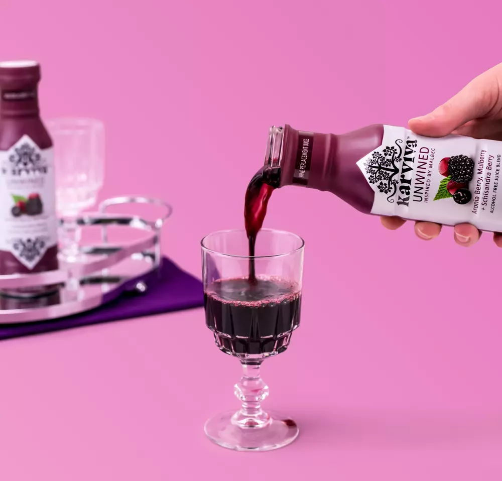 Karviva Unwined Wine Replacement Juice是一种功能性葡萄酒替代饮料,是高糖高热量传统葡萄酒的健康替代品。产品由桑葚,五味子,黑樱桃和野樱莓等浆果加工制成。尽管这款饮料没有传统的酿酒过程,但却模拟出类似葡萄酒的绝佳口感、颜色和质地。
