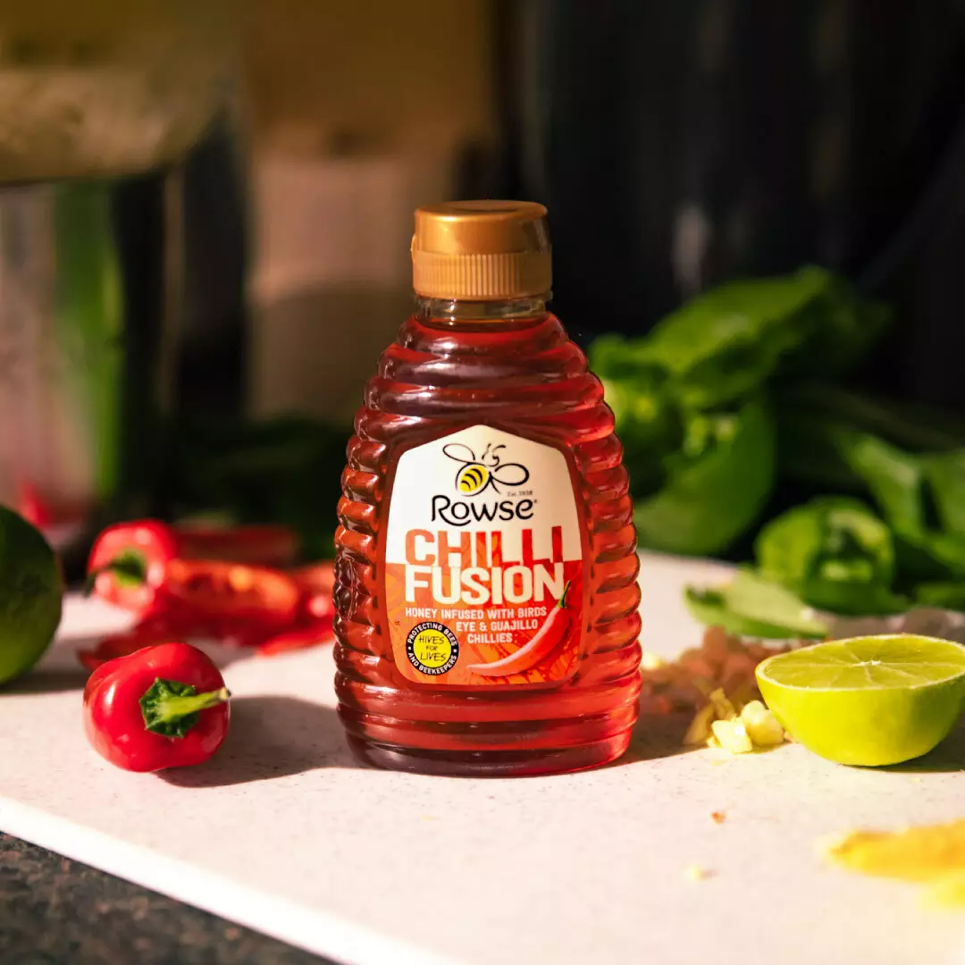 Rowse Chilli Fusion Honey是一款含辣椒的蜂蜜,产品仅采用蜂蜜,泰国辣椒(Birds eye chillies)和瓜吉洛辣椒(Guajillo)三种成分制成。辣椒的加入不仅使蜂蜜的颜色呈现诱人的亮红色,也带来了更丰富的甜辣味体验,扩大了产品在烹饪加工时的作用范围。