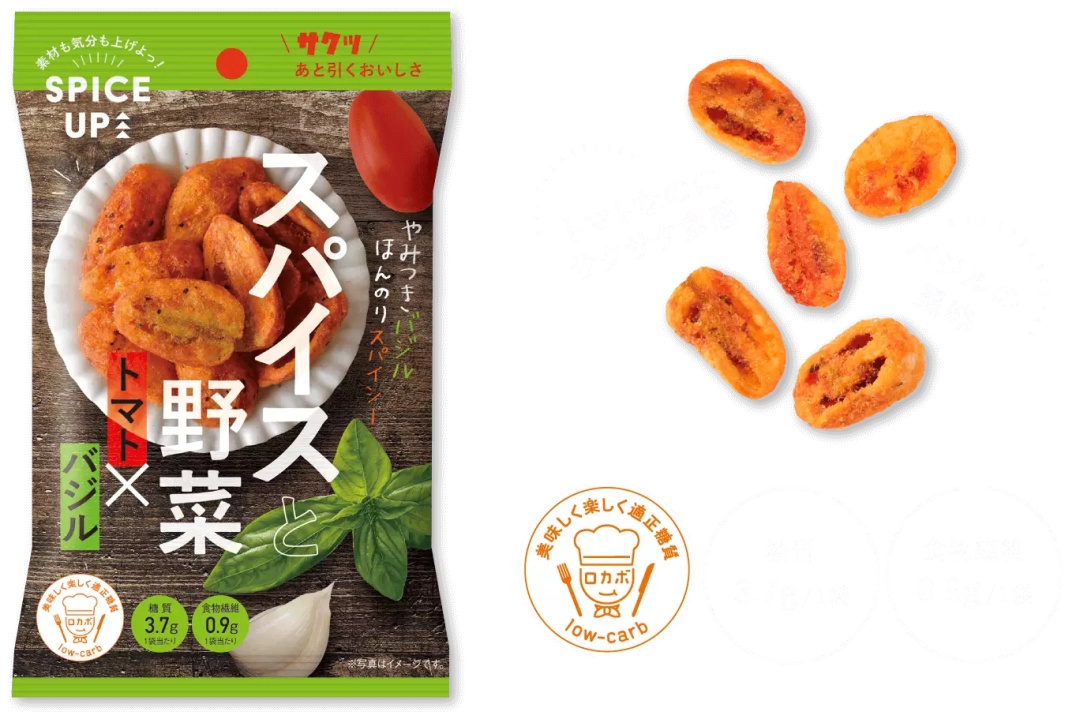 日本无负罪感果蔬零食「スパイスアップ!」推出了一系列由香辛料调味的蔬菜脆片零食,其中就包含使用圣女果制成的番茄脆片。将番茄切块速冻后,通过低温真空状态油炸蔬菜,不破坏食材的色香味,保持鲜美本味。每包番茄干(11g)含有0.9g纤维和仅3.7g糖,可以用作沙拉等的浇头,也可作为佐酒小菜。