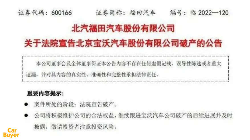 为什么说终于?早在今年上半年,福田汽车发布公告,称宝沃汽车因无力清偿到期债务,正在走申请破产清算的流程。