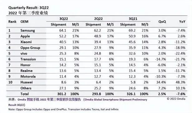 市场研究机构Omdia公布的全球手机品牌销量榜显示,2022年第二、三季度全球手机销量榜前十名中,除苹果、三星外,其余8席均被中国品牌揽入怀中,小米、OPPO、vivo、荣耀、Realme、华为等均榜上有名。
