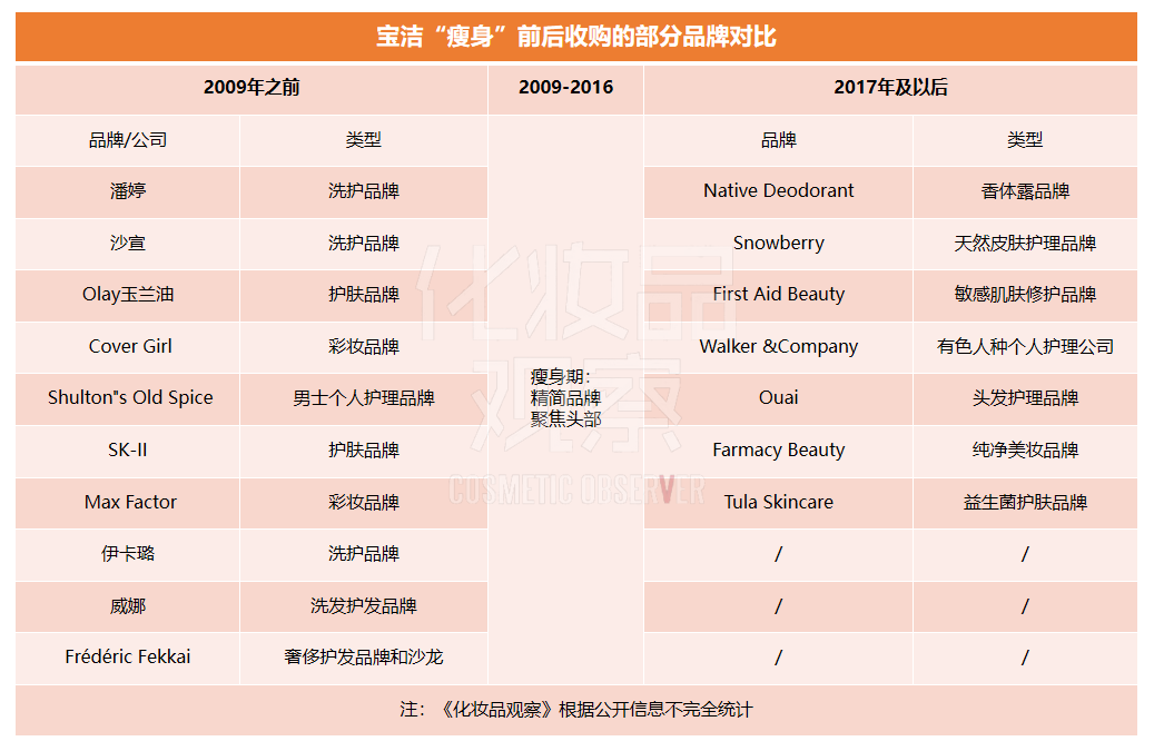 这一收购逻辑的确立,与宝洁的过往以及对未来的趋势洞察密不可分。细看宝洁在美妆个护领域的收购案,会发现宝洁的“瘦身期”是一个明显的分水岭。