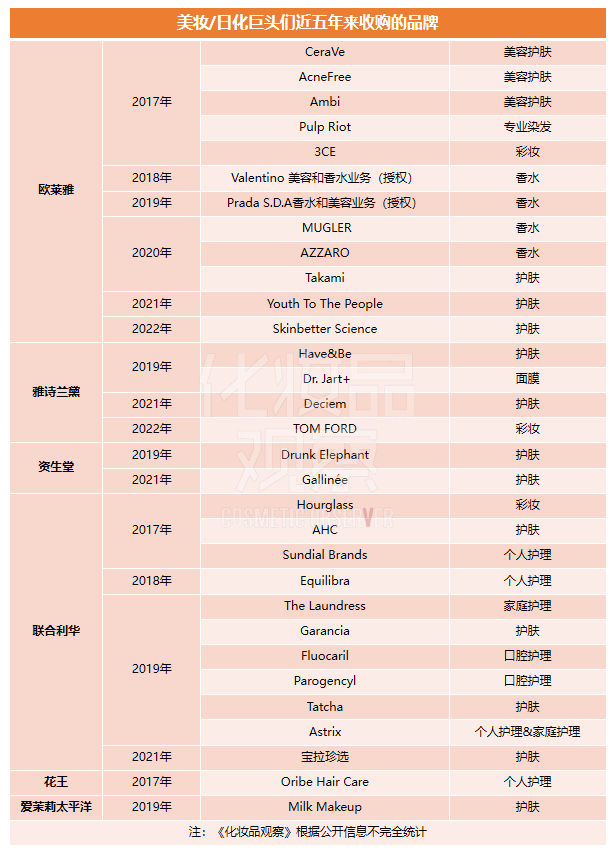 例如欧莱雅依旧秉持大规模收购的特性,基于互补思路将差异化的品牌纳入囊中形成较为全面、细分的品牌矩阵,因此近五年收购品牌覆盖护肤、彩妆、香水、美发等品类;雅诗兰黛在数量上较为克制,在品牌选择上维持中高端调性,但近两年顺应市场趋势也选择了 The Ordinary 这类平价品牌;联合利华则通过收购Tatcha、宝拉珍选等品牌弥补护肤品类的欠缺。