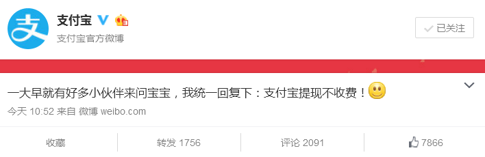 这也不能怨支付宝,和当时的微信情况是一样的,就是刚开始用的人少,成本低,但是用户基数增大的话,这成本就惊人了,支付宝说我不能一直给你们贴钱啊,我说你们可以用蚂蚁积分兑换已经是给你们想办法省钱了。刚开始时候,支付宝需要的是资金流通,而这时候资金只能从用户手中来,用“免费”来吸引更多的用户把钱放到支付宝是明智之举,可当时明知道日后会是要收费,还在微信公布提现收费时候出来踩一脚就不对了。把用户溜一圈,What are you 弄啥咧?