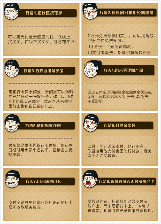 可能有人说支付宝和微信不同,支付宝可是蚂蚁金服的主要业务啊,如果大家不愿意放钱到支付宝后果很严重的。其实没什么差别,支付宝不会造成用户流失,对蚂蚁金服来说根本无所谓。因为我们可以分成三种情况,第一种,就是像我这种穷苦大众,根本不会超过2万额度好嘛。第二种,小额资金运转,和微信一样,现在走哪儿基本都可以用支付宝,花呗,凡是花钱地方就用支付宝,何必非得提现呢?第三种,有人问土豪呢?哪个土豪的大钱是支付宝转账不是走银行的?那你又问,那土豪就想支付宝转账咋办?土豪非要支付宝转账还在乎那几个手续费?