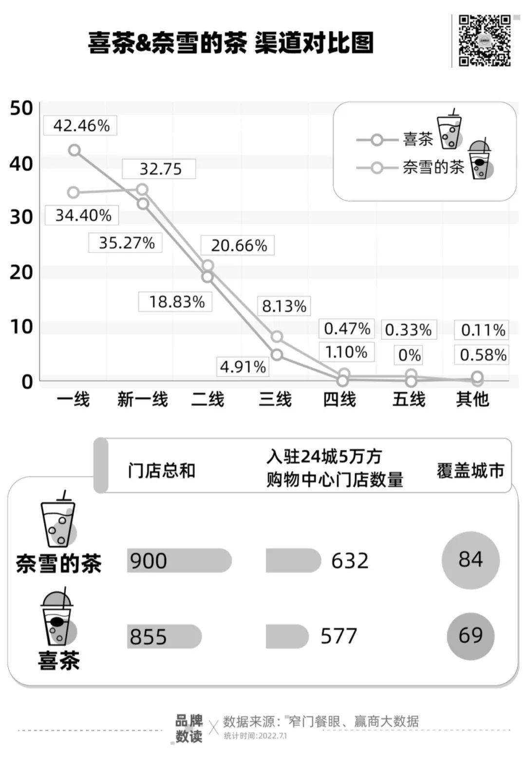 品牌数读在今年7月初发布的数据对比,也揭示了奈雪与喜茶激烈的竞争态势。单从渠道和门店数量来看,奈雪与喜茶不相上下。如今伴随自身门店破千,再加上乐乐茶的140家门店,奈雪系手握门店数量超1140家,瞬间甩开喜茶不少。