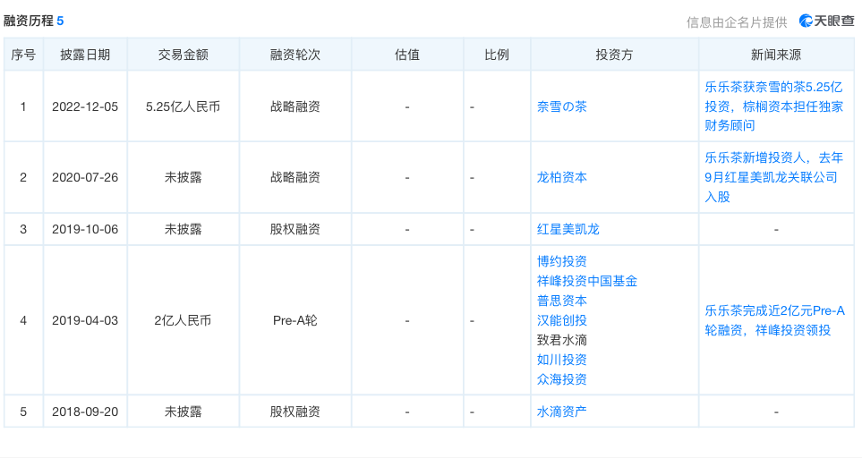 2019年4月,已在北京、上海、广州、杭州、南京、西安等一线、新一线城市的商业中心开设近30家直营店的乐乐茶,宣布完成近2亿元Pre-A轮融资,由祥峰投资领投,王思聪的普思资本跟投。后续,据乐乐茶方面对晚点 LatePost透露,该轮融资折合1.75亿元,投后估值17.1亿元。