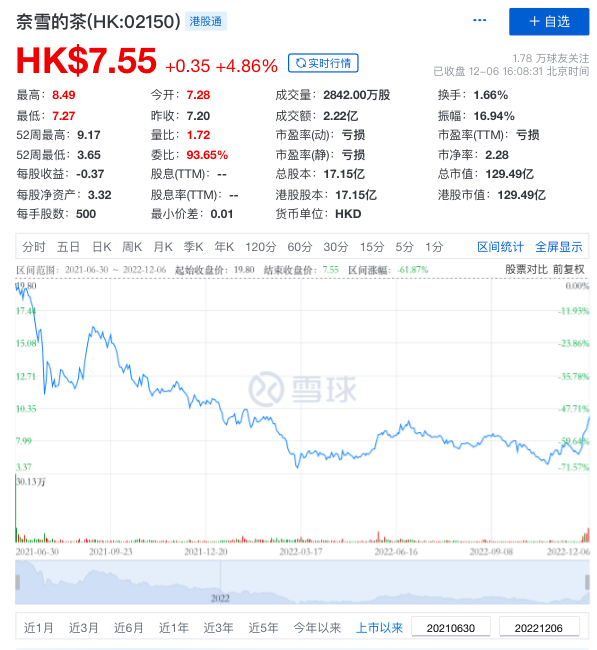 此次入股乐乐茶,无疑进一步刺激了奈雪的股价。截至12月6日收盘,奈雪涨4.86%报7.55港元/股,市值129.49亿港元。
