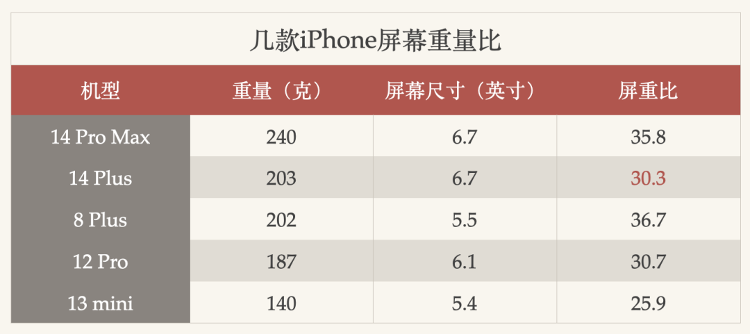 这样一看,是不是一目了然?数字越小越好,表示你能用更轻的重量换得更大的屏幕尺寸,14 Plus是除了13 mini之外,屏重比最低的。