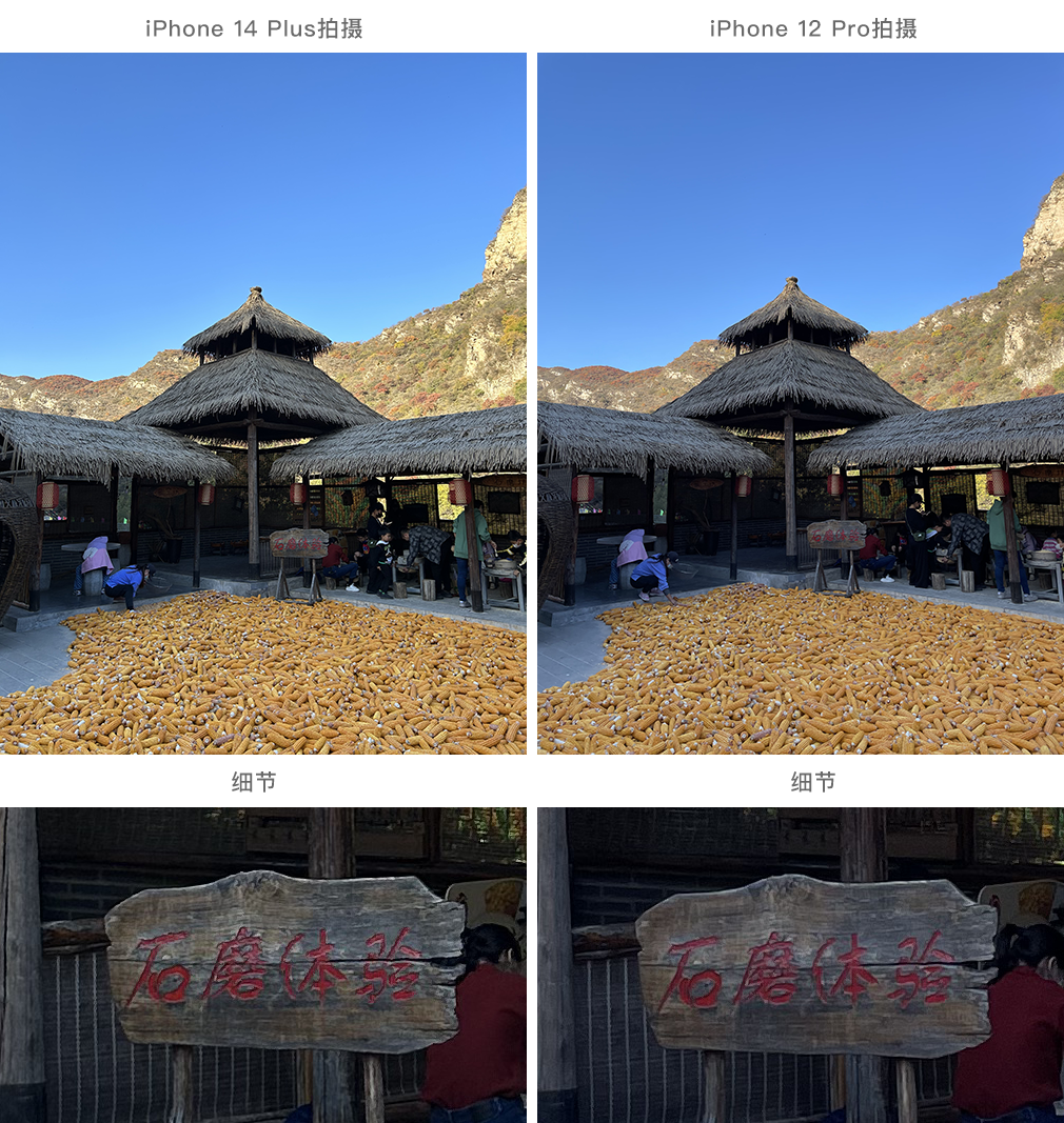 从上面这个场景对比可以看到,缩小了看,其实这几代iPhone主摄的成像肉眼可看的变化很小。但仔细看会发现,14 Plus主摄拍摄画面比12 Pro主摄拍摄画面蓝天在最亮和最暗之间的范围更大,同时画面的细节更锐利、色彩饱和度,照片的通透感也会更好些。
