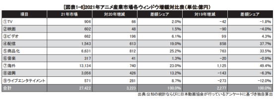 从下图动画产业中各事业具体市场情况可以看出,海外、商品化及配信这三大窗口的同比大幅增长,是日本动画市场能够快速回暖并增长的主要原因。