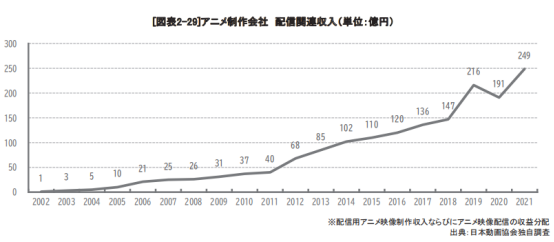 2021年,日本动画制作公司配信关联收入同比上升了30.37%,为249亿日元,摆脱了因疫情影响出现的作品制作交付延期、作品采购速度下降等短期混乱。