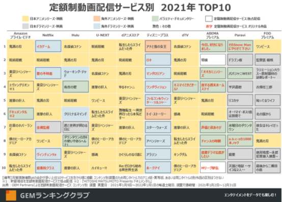 GEM Partners发布的《2021年各视频网站定额制视频配信内容TOP10》显示,在各视频网站上,《鬼灭之刃》《咒术回战》《东京复仇者》《名侦探柯南》《海贼王》《银魂》等经典人气动画依旧占据高位,成为收入支柱。