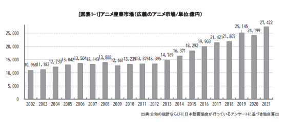 日本动画产业市场从2010年至2019年连续10年保持增长,虽然2020年遭受疫情打击首次出现下降,但2021年市场快速调整回暖,2021年日本动画产业市场规模为2万7422亿日元,同比大幅增长13.3%,刷新了最高历史记录,比2019年的历史高峰增长了9.1%。