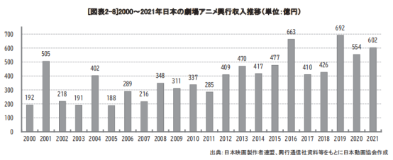 据日本动画协会《日本动画产业报告2022》,2021年日本剧场版动画票房总收入位602亿日元,同比增长8.6%,与2019年的692亿日元相比减少了90亿日元。