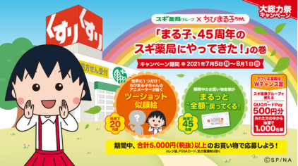 日本大型连锁药妆店SUGI药局与《樱桃小丸子》合作,任命《樱桃小丸子》为45周年特别形象大使,活动期间只要在旗下店铺消费超过5000日元(不含税),即可参加抽选获得限定礼品及商品券。