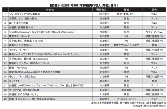 2021年票房收入超10亿日元的剧场版动画有11部,比20年增加3部。