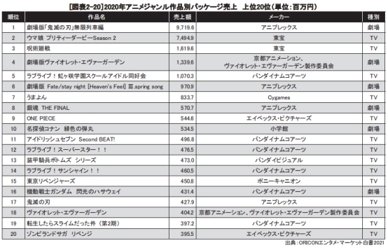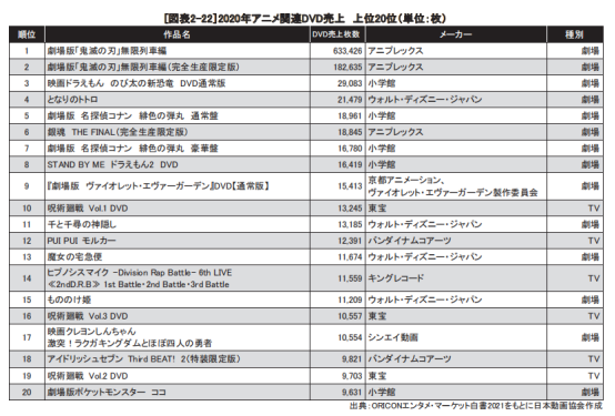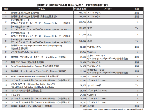 2021年动画影像销售额TOP20 数据来源:ORICON娱乐市场白皮书2021
