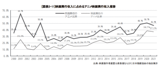 2021年剧场版动画票房收入占到日本电影票房收入的46.9%,虽然比去年的50.7%有所下降,不过也近乎占到日本电影票房一半收入。