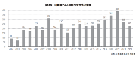 2021年动画制作公司的剧场版动画销售额229亿日元,同比下降14%,比2019年下降40%。自2014年来最低值。