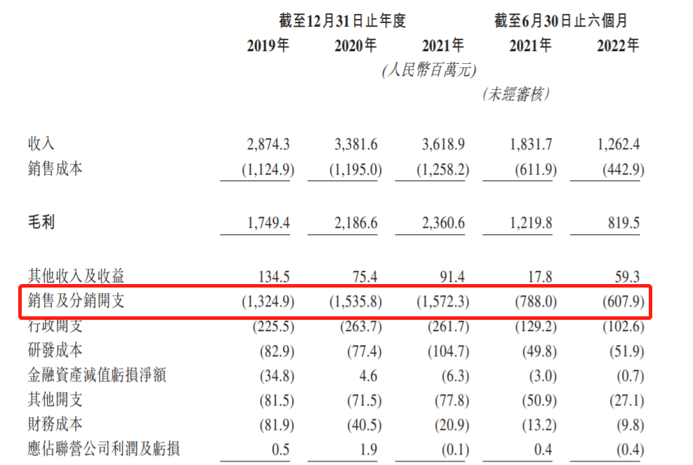 多年过去,重金营销依然是上美集团的特点。2019年至2022上半年,上美集团累计销售及分销费用达到50亿元,其中营销推广费用超过33亿元,在总销售费用中占比超过60%。2022年上半年,销售费用占营收比高达48.2%,较2021年同期的43%进一步上升。
