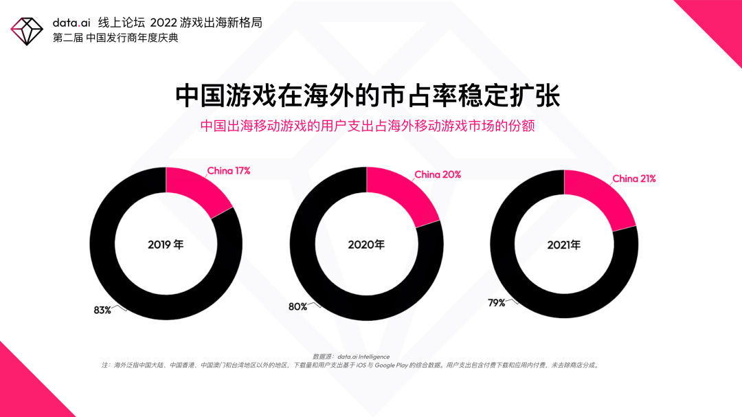 而根据数据分析机构data.ai的统计,2021年中国出海移动游戏的用户支出占海外移动游戏市场的份额为21%。