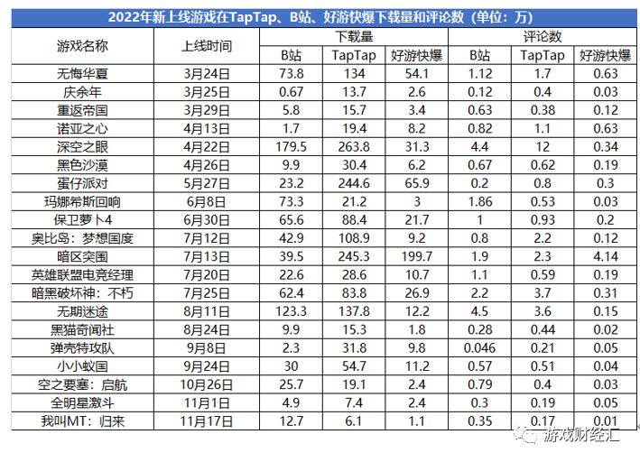热门游戏下载情况:通常来说,游戏下载量越高,证明渠道的分发实力更强。为了对比B站、TapTap、好游快爆三家平台分发能力,游戏财经汇一共挑选了20款22年以来上线的热门游戏。数据对比结果是,单看下载情况已被TapTap赶超,部分品类甚至不及好游快爆。