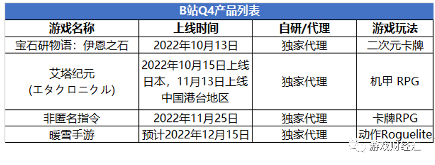 B站Q4产品不少,预计将有4款产品上线,目前已上线了3款。