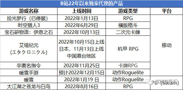 据游戏财经汇不完全统计,22年B站预计将新增7款独代产品(剔除上线半年就宣布停服的《拾光梦行》),其中手游5款,PC游戏2款。