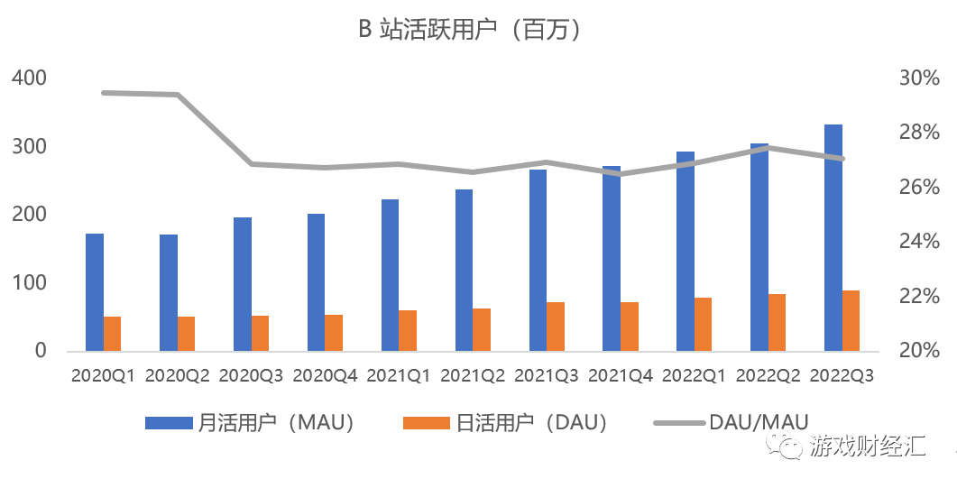 随着B站不断破圈,B站用户规模不断扩张。2022年Q3,B站月活超3.33亿,日活超9000万,均同比增长接近25%,每个用户平均每天花在B站的时间达到96分钟(不包含B站运营的游戏、B站漫画和猫耳上的时间),较Q2增长了7分钟。