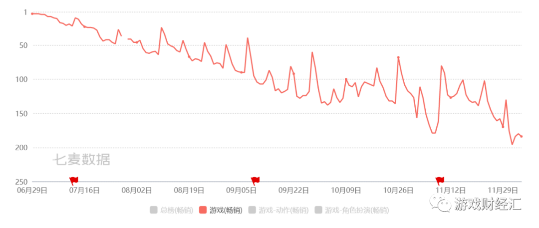 图:《时空猎人3》上线以来iOS游戏畅销榜排名趋势;来源:七麦数据
